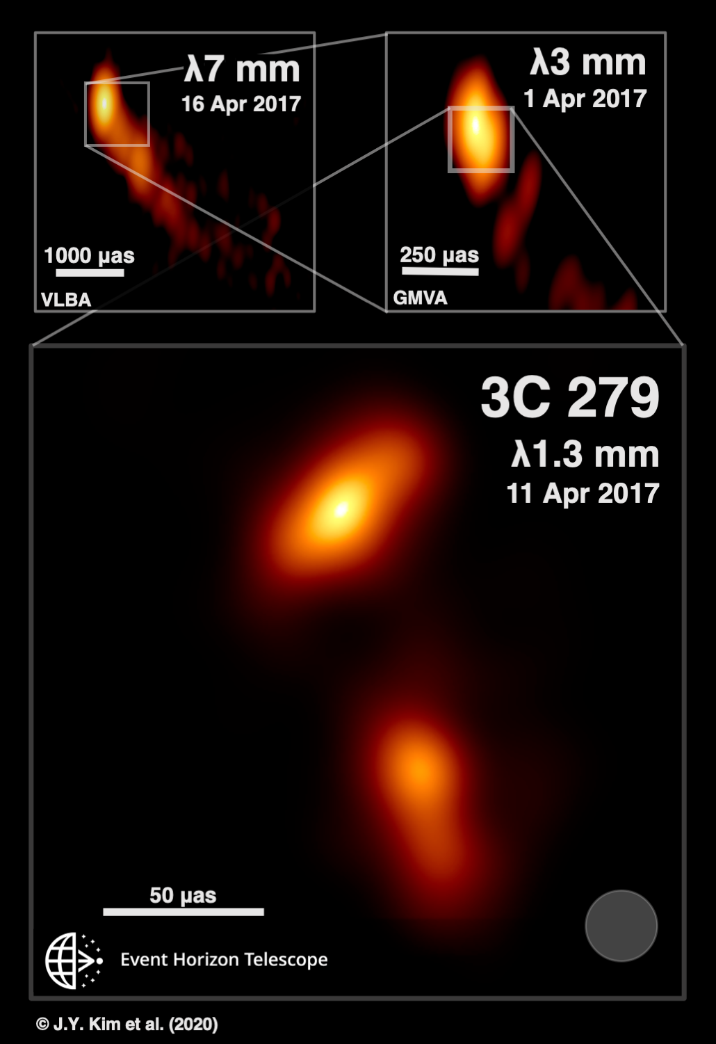 En un comunicdado, la UNAM informó que hace un año, la colaboración del EHT publicó la primera imagen de un agujero negro en la radiogalaxia cercana M 87. En esta ocasión, presenta resultados de las observaciones realizadas en abril de 2017 del cuásar 3C 279, una galaxia a 5 mil millones de años luz de distancia observada en la dirección de la constelación de Virgo, clasificada como un cuásar porque un punto de luz en su centro brilla intensamente y aumenta y disminuye su brillo–es decir, es de brillo variable–cuando grandes cantidades de gases y estrellas caen en el disco de acreción alrededor del agujero negro gigante que se estima existe en su interior. Se ha calculado que el agujero negro tiene aproximadamente mil millones de veces la masa del Sol, es decir, 200 veces más masivo que el agujero negro en el centro de nuestra galaxia, la Vía Láctea. Vemos que arroja algo de gas hacia afuera en dos finos chorros de plasma (gas muy caliente) con forma parecida a la de una manguera a velocidades cercanas a la velocidad de la luz.