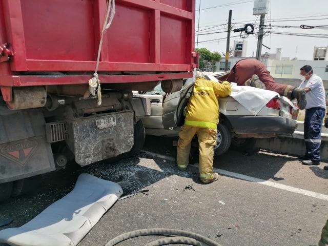 El coche en el que viajaba el hoy lastimado es un Nissan Tsuru, color arena con matrícula PGE684G. La otra unidad es de la marca Freightliner, cabina blanca y caja color rojo.