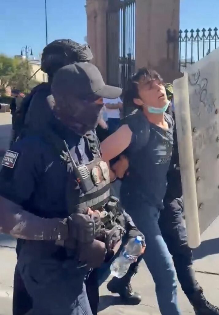 Tras cerca de 30 minutos, los policías estatales salieron lanzando balas de goma y detuvieron a 3 jóvenes identificados como Luis Arturo de 23 años, Jorge Iván de 21 años de edad y Eduardo de 17 años por alterar el orden público, a quienes gritaron “quiere llorar”, al momento de ingresarlos a un costado de Palacio de Gobierno.