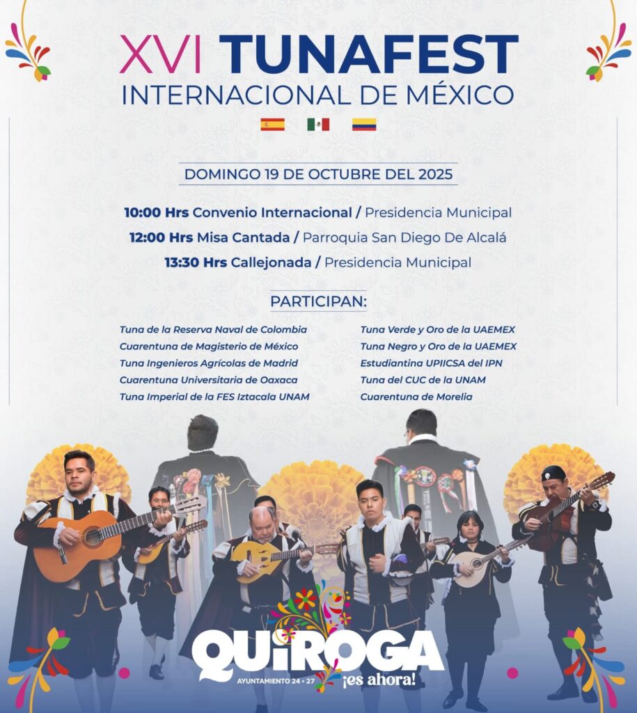 Con un ambiente lleno de alegría, el TunaFest Internacional reunirá a tunas y estudiantinas de España, Colombia y diferentes estados de México, que recorrerán las calles de Quiroga con sus canciones, su humor y su espíritu universitario, haciendo de cada presentación una verdadera fiesta.