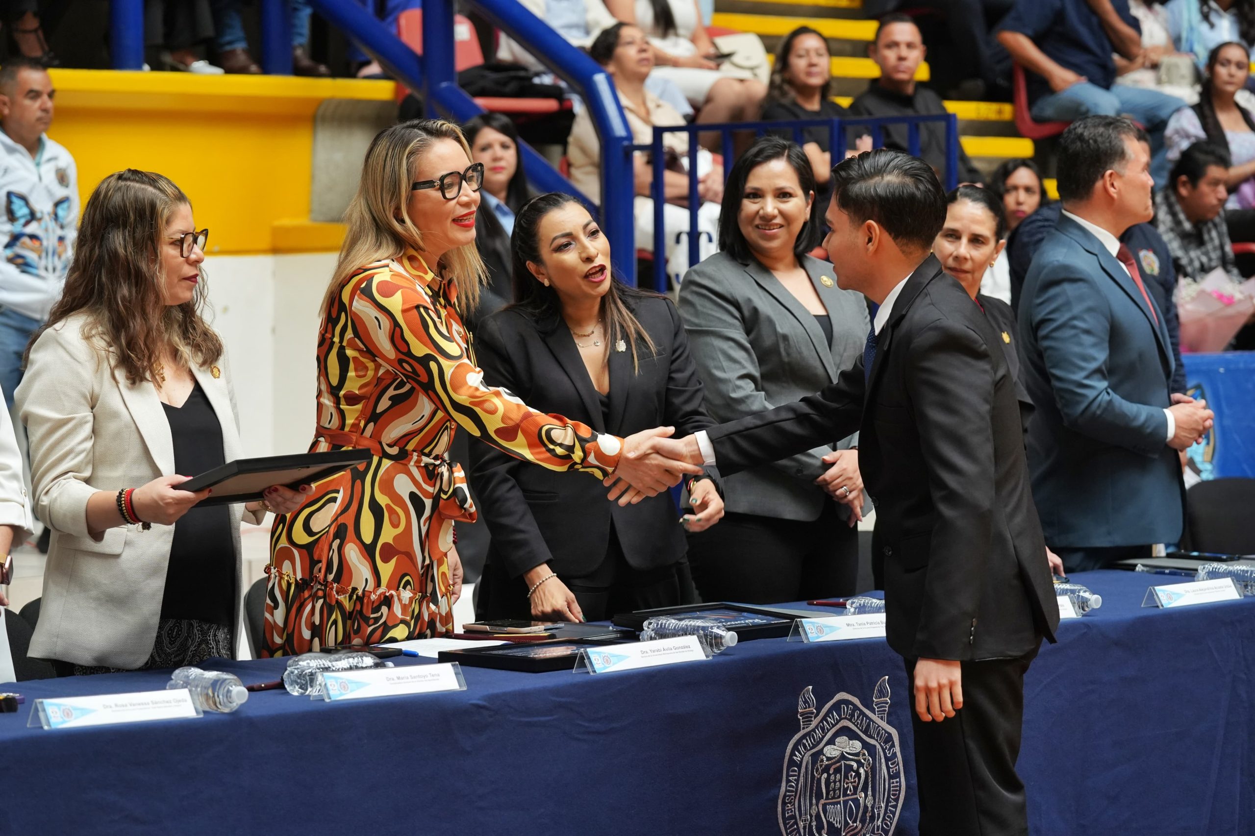 Acompañada de la coordinadora general de la División del Bachillerato Nicolaita y de las directoras de las preparatorias ubicadas en Morelia, la rectora manifestó su satisfacción por compartir este momento con las y los jóvenes graduados, quienes dijo, egresan de uno de los planteles de nivel medio superior más grandes de la UMSNH.