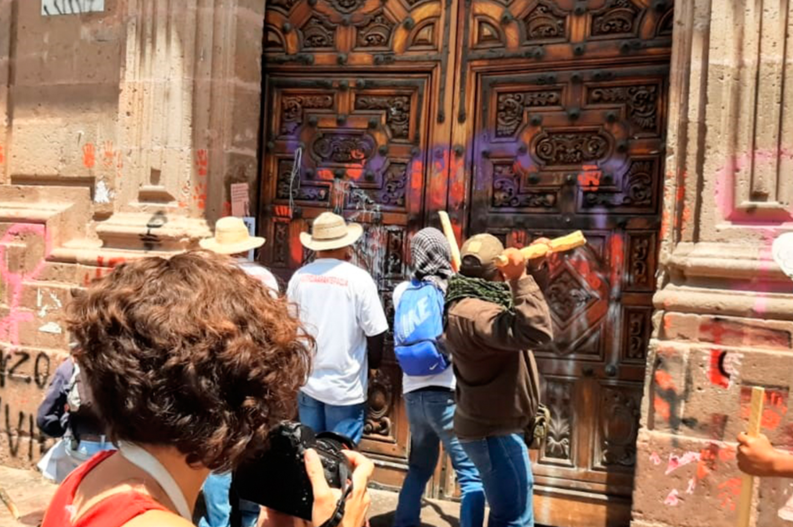 Al concluir la manifestación conmemorativa de los 4 años de la incursión policial en la comunidad indígena de Arantepacua en el centro histórico de Morelia, un grupo de comuneros golpeó con troncos la puerta principal de Palacio de Gobierno durante unos instantes, para después instalar un templete y realizar un mitin.