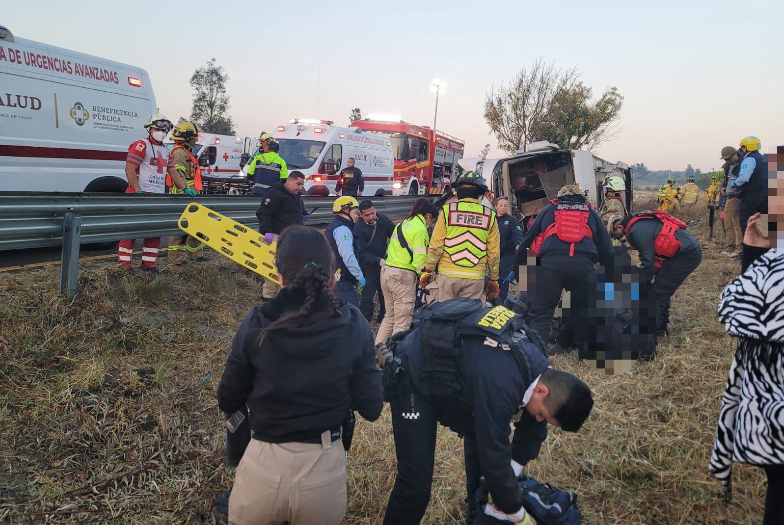 Policía Morelia trabaja en coordinación con cuerpos de emergencia para atender un hecho de tránsito en la carretera Morelia–Pátzcuaro, a la altura de Tiripetío, donde un autobús volcó, dejando como saldo personas lesionadas y fallecidas.