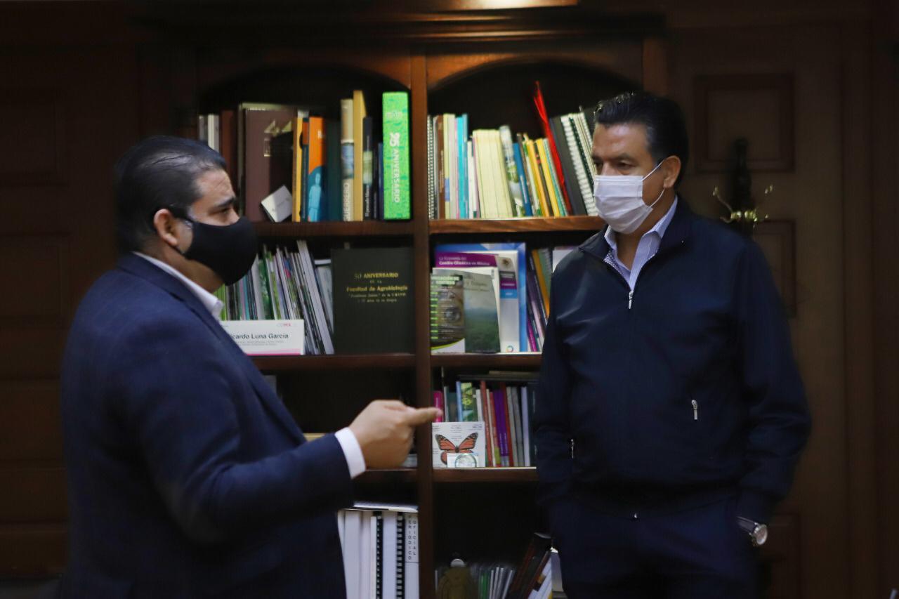 Morelia, Michoacán, a 19 de noviembre de 2020.- Para fortalecer la vinculación de los estudiantes del Colegio de Estudios Científicos y Tecnológicos del Estado de Michoacán, CECyTEM, con el cuidado y protección del medio ambiente, Ricardo Luna García, secretario de Medio Ambiente, Cambio Climático y Desarrollo Territorial, acordó con el director general, José Hernández Arreola, colaboración entre ambas instituciones.