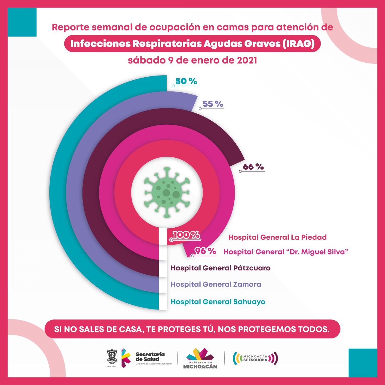 Los hospitales de La Piedad, Civil de Morelia, Pátzcuaro, Zamora y Sahuayo reportan mayor ocupación de camas para la atención de pacientes COVID-19 con 100, 96, 66, 55 y 50 por ciento de su capacidad resolutiva, respectivamente.
