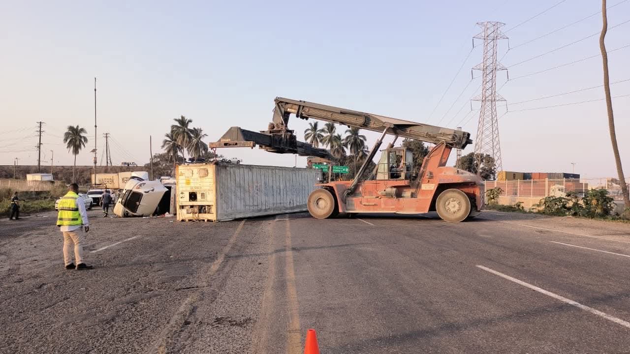 La unidad siniestrada corresponde a un tractocamión International de color blanco, con placas 96-BB-4R, el cual terminó volcado y bloqueando la vialidad.