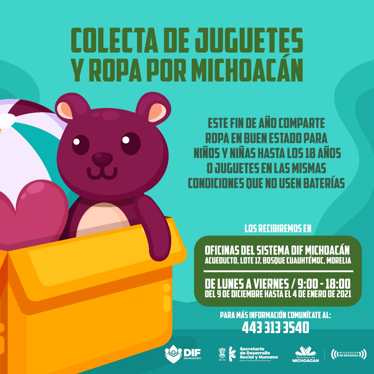 Morelia, Michoacán, El Sistema para el Desarrollo Integral de la Familia, DIF Michoacán, en coordinación con la Secretaría de Desarrollo Social y Humano (Sedesoh), arrancó este miércoles la “Colecta de Juguetes y Ropa por Michoacán”.