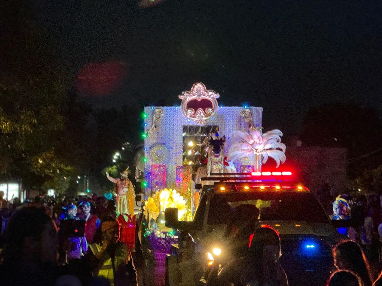El desfile fue acompañado por decenas de bailarines y carros alegóricos que iluminaron la noche y alegraron a las familias reunidas a lo largo del trayecto, convirtiéndose en un espectáculo lleno de color y tradición.