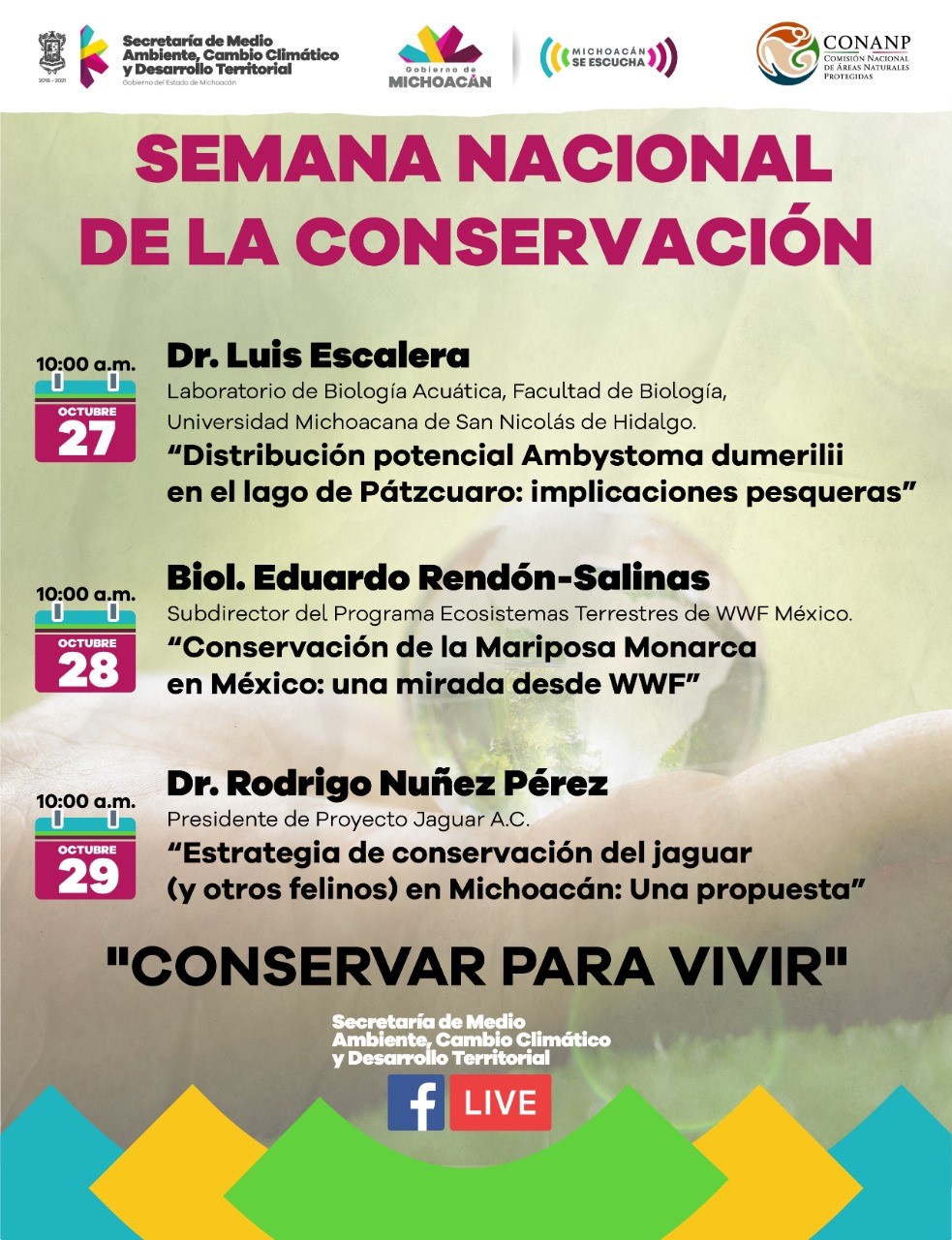 Finalmente, explicó el secretario de Medio Ambiente que para el jueves 29 de octubre, a las 10 de la mañana, el tema que se presentará en Facebook Live es la “Estrategia de conservación del jaguar (y otros felinos) en Michoacán: Una propuesta”, impartida por el doctor Rodrigo Núñez Pérez, presidente de Proyecto Jaguar A.C.