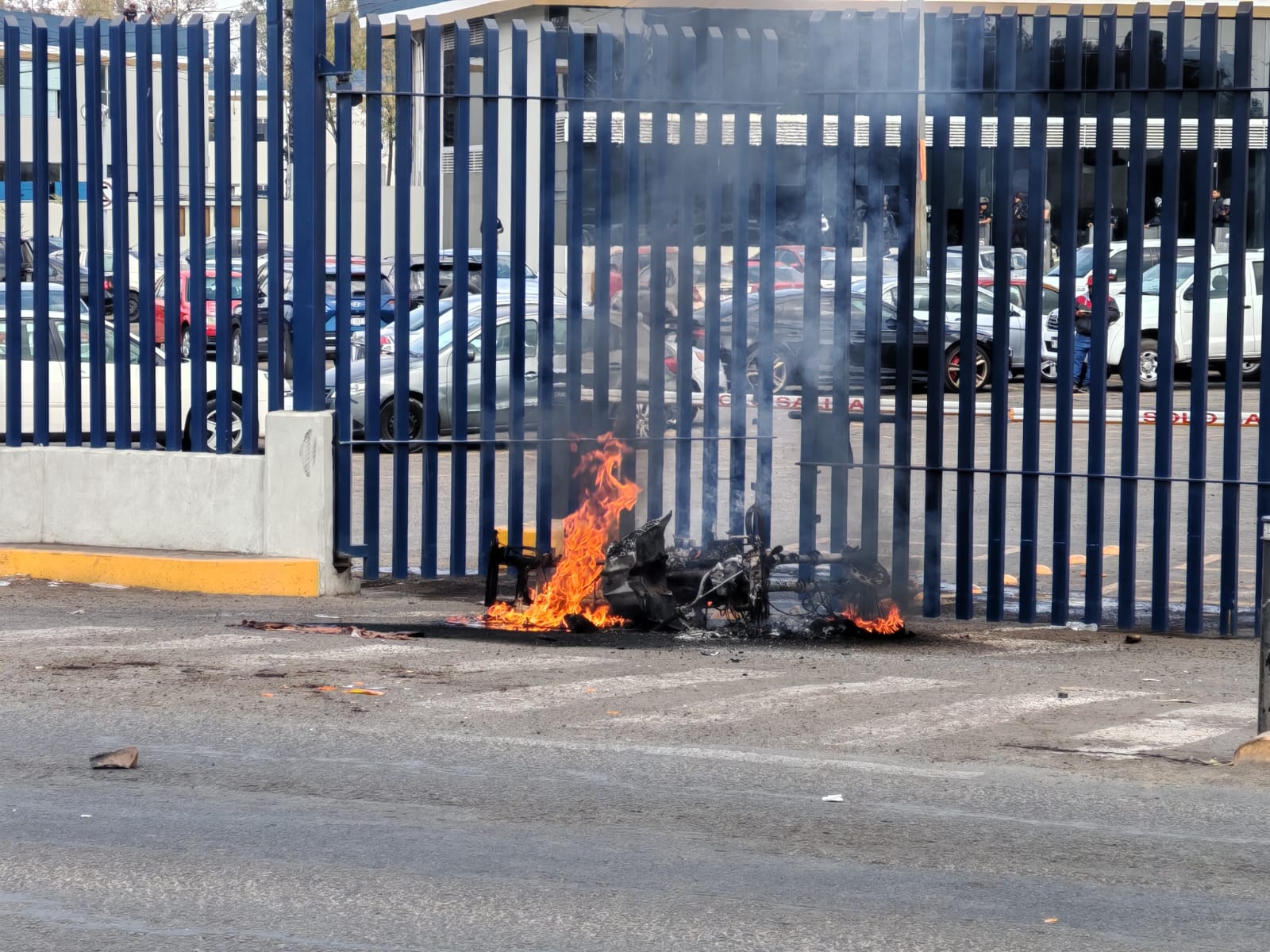 Morelia, Mich.- Un grupo de comuneros de Carapan quemó una motopatrulla de la Guardia Civil (GC) afuera del barandal perimetral de la Fiscalía General del Estado (FGE), en la ciudad de Morelia.