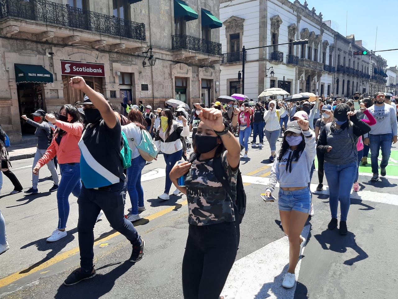 Integrantes de la ONOEM (Organización de Normales Oficiales del Estado), salieron a manifestarse este lunes por las principales calles de la capital michoacana, donde realizaron un recorrido del monumento a Lázaro Cárdenas por Avenida Nocupétaro hasta llegar al monumento al Pípila, para después continuar rumbo a Palacio de Gobierno.
