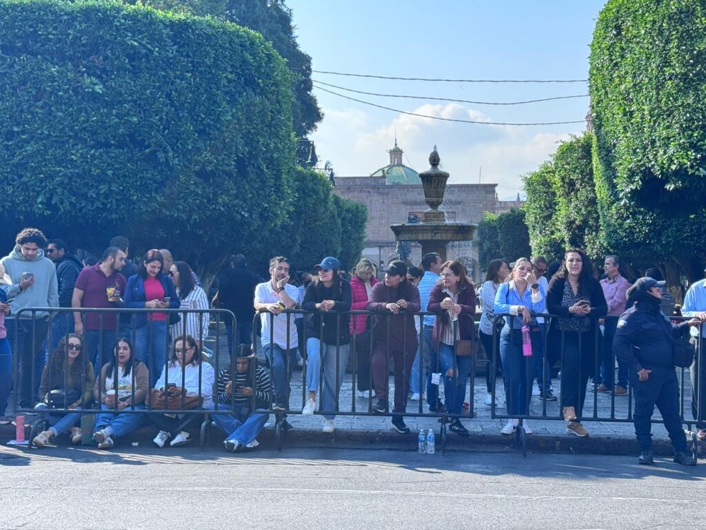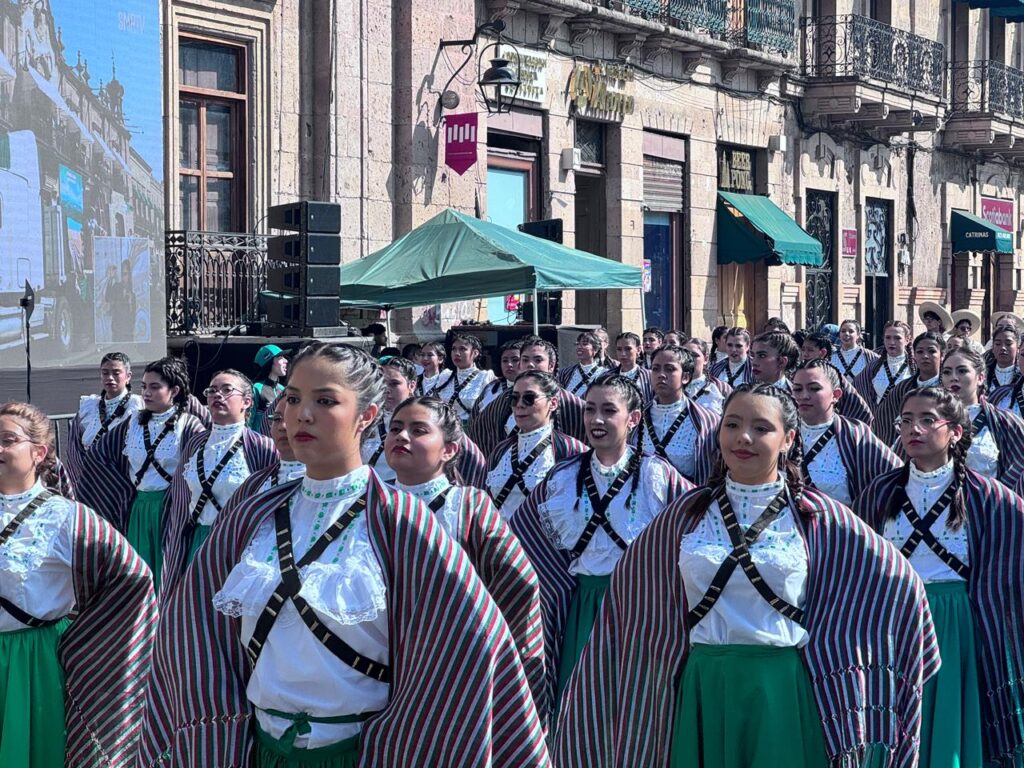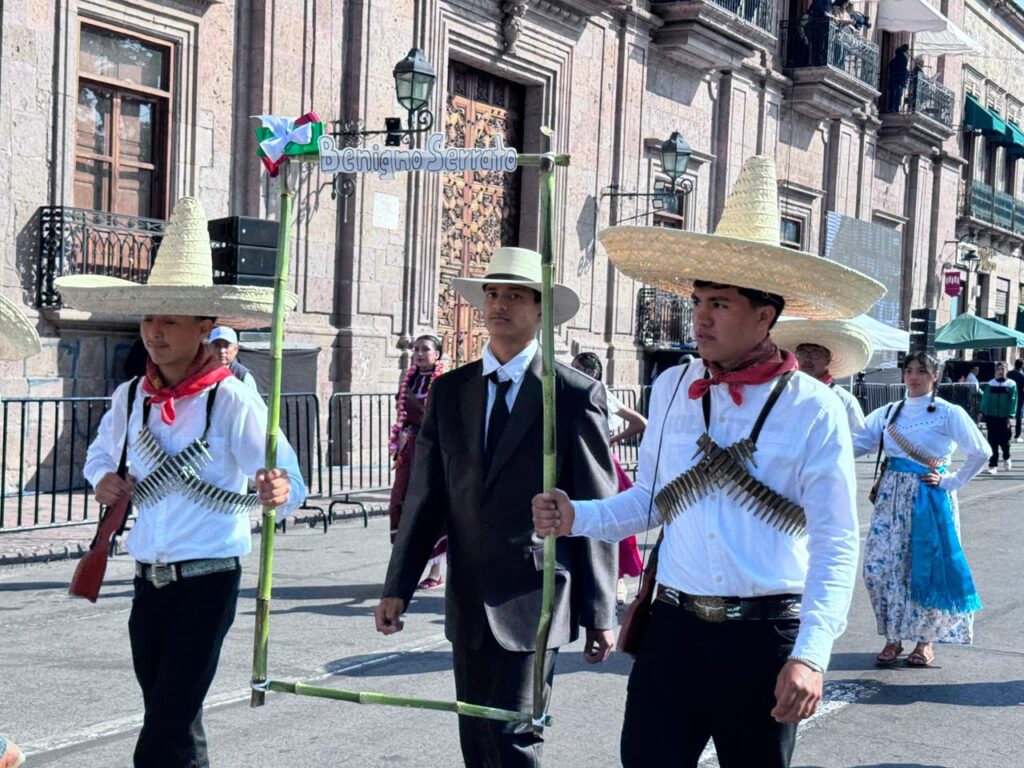 El desfile fue encabezado por el gobernador Alfredo Ramírez Bedolla, desde el balcón principal, acompañado por representantes del Poder Judicial y del Congreso de Michoacán.