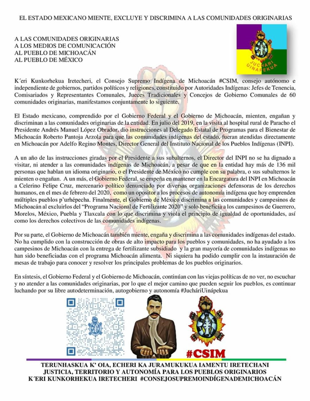 En un comunicado, en el marco de la visita del Presidente Andrés Manuel López Obrador a Michoacán, el Consejo Supremo Indígena de Michoacán (CSIM), consejo autónomo conformado por autoridades indígenas de 60 comunidades, denunciaron públicamente que el Gobierno Federal, así como el Gobierno de Michoacán, mienten, excluyen y discriminan a las comunidades originarias.
