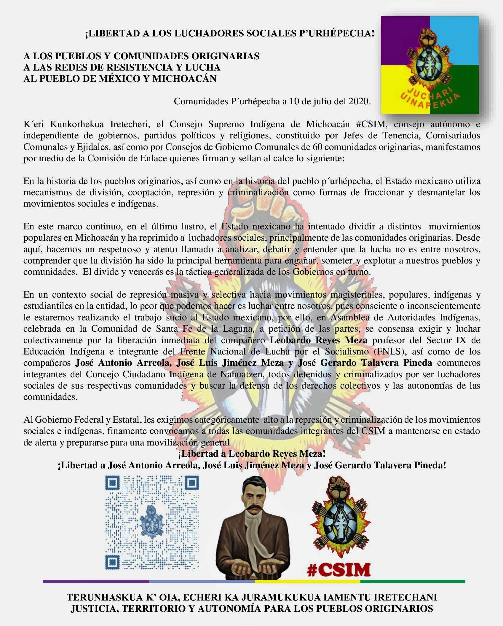 Mediante un comunicado, el Consejo Supremo Indígena de Michoacán #CSIM exigió la liberación del profesor Leobardo Reyes Meza profesor del Sector IX de Educación Indígena, así como de José Antonio Arreola, José Luis Jiménez Meza y José Gerardo Talavera Pineda integrantes del primer Concejo Ciudadano Indígena de Nahuatzen a quienes reconocieron como luchadores sociales de las comunidades p´urhépecha.