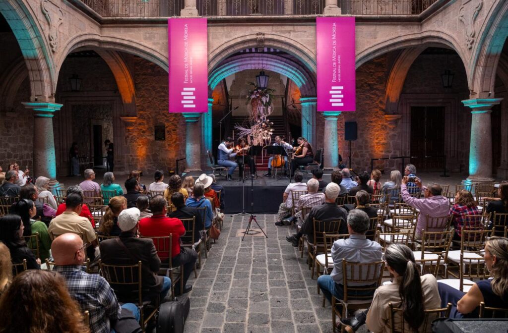Morelia, Mich.- La tarde del lunes, el Palacio Municipal se llenó de historia y emoción con la presentación del Cuarteto Q-Arte en el marco del Festival de Música de Morelia Miguel Bernal Jiménez, ofreciendo a las 13h un concierto que recorrió la riqueza de la música de cámara de México y Latinoamérica.