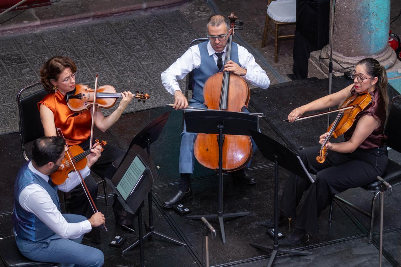 Morelia, Mich.- La tarde del lunes, el Palacio Municipal se llenó de historia y emoción con la presentación del Cuarteto Q-Arte en el marco del Festival de Música de Morelia Miguel Bernal Jiménez, ofreciendo a las 13h un concierto que recorrió la riqueza de la música de cámara de México y Latinoamérica.