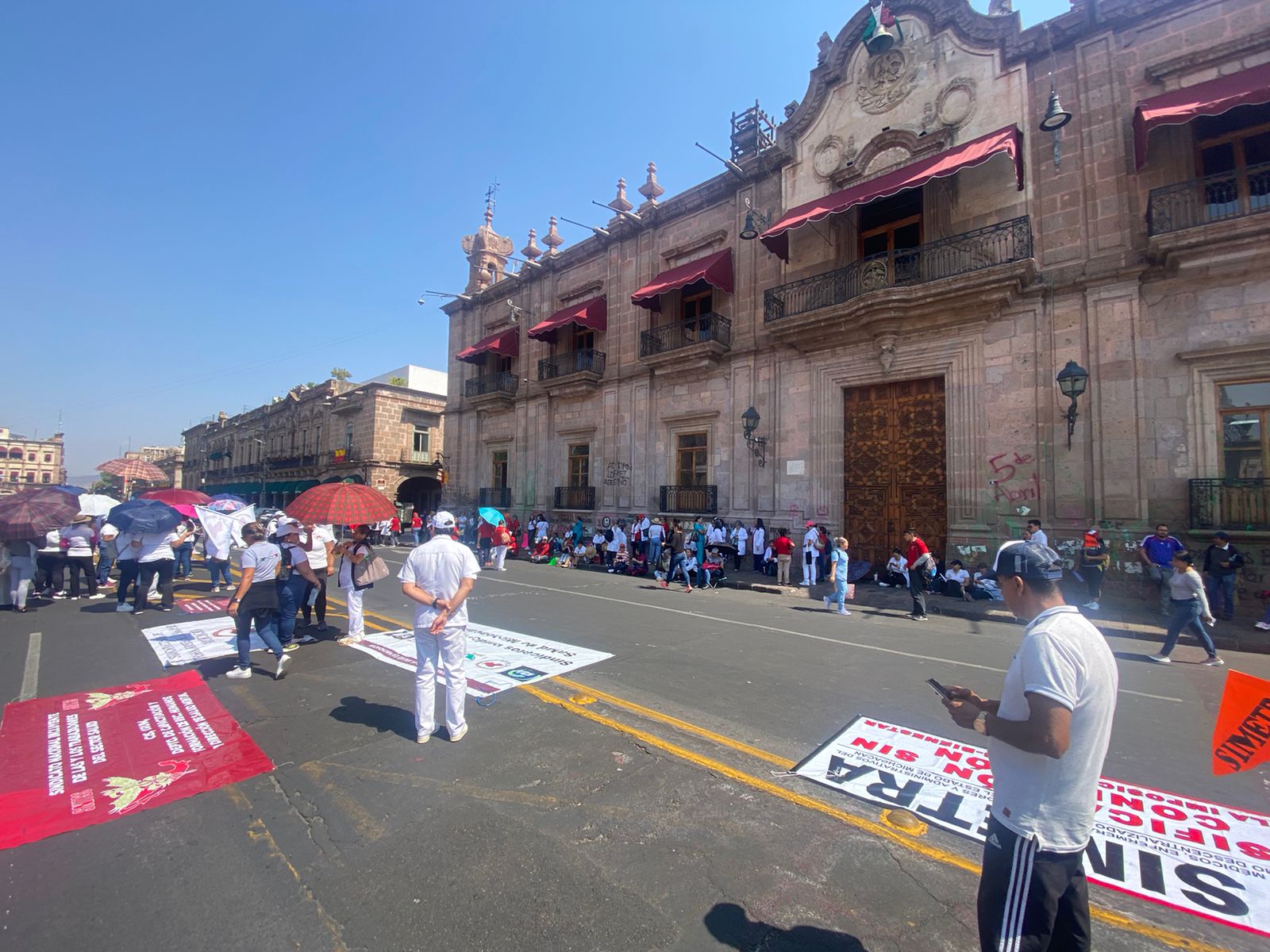 Los sindicalizados bloquearon desde temprana hora el Libramiento Sur frente a Casa de Gobierno y luego se trasladaron al centro de Morelia, donde se manifestaron frente a la sede del Poder Ejecutivo y denunciaron la negativa gubernamental a cumplir con lo que establece la norma.