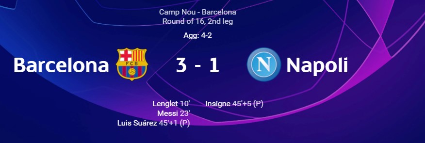 Ya en la segunda mitad el Napoli insistió durante los 45 minutos restantes en anotar 2 goles que les dieran el pase a los cuartos de final, pero a pesar de tener algunas oportunidades, no pudieron anotar y el Barcelona avanzó a los cuartos de final, donde se medirá ante el equipo alemán del Bayern Múnich.