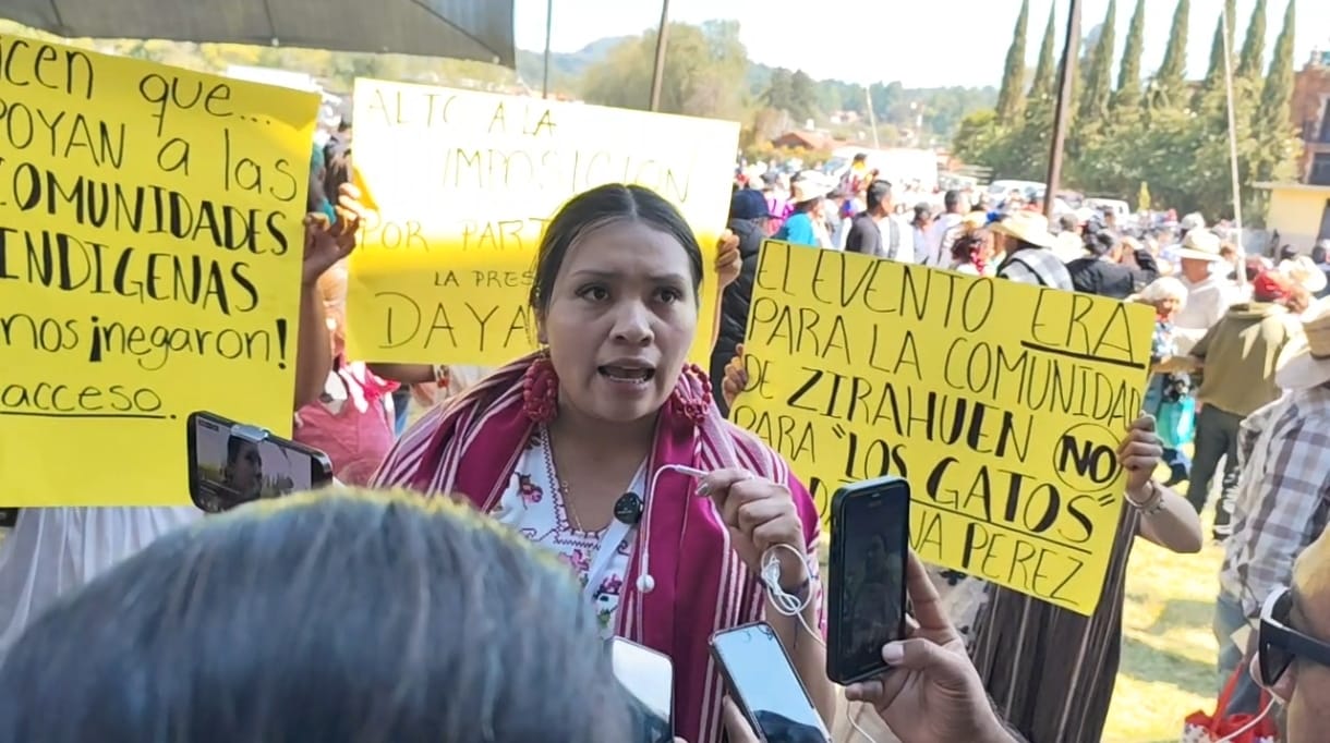 Con pancartas en mano, mujeres de la tenencia de Zirahuén, municipio de Salvador Escalante, denunciaron discriminación y doble discurso de la alcaldesa Dayana Pérez, ya que se impidió el acceso al evento presidencial a cerca de 400 habitantes de la comunidad indígena, pese a que se les obligó a limpiar el pasto de la cancha para el acto oficial.