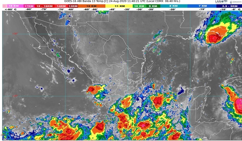 “Para el día de hoy se pronostican lluvias intensas con puntuales torrenciales de 150 a 250 milímetros en Jalisco, Colima, Michoacán y Guerrero. Cabe mencionar que, en algunas zonas, las lluvias vendrán acompañadas de descargas eléctricas, posibilidad de caída de granizo y rachas de viento de fuertes a intensos durante las tormentas”.