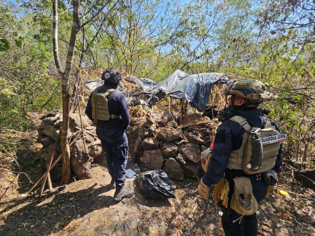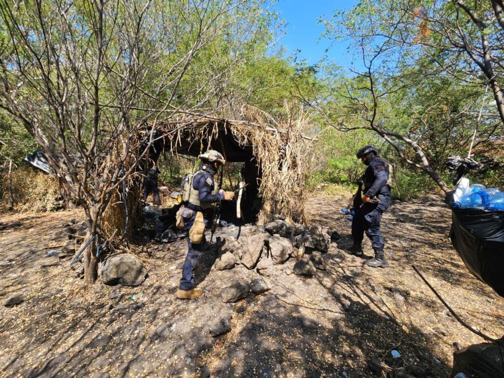 Buenavista, Michoacán.- Elementos de las secretarías de Seguridad Pública (SSP) y de la Defensa Nacional (Defensa), localizaron e incineraron cuatro campamentos clandestinos presuntamente utilizados por grupos delictivos en el municipio de Buenavista.