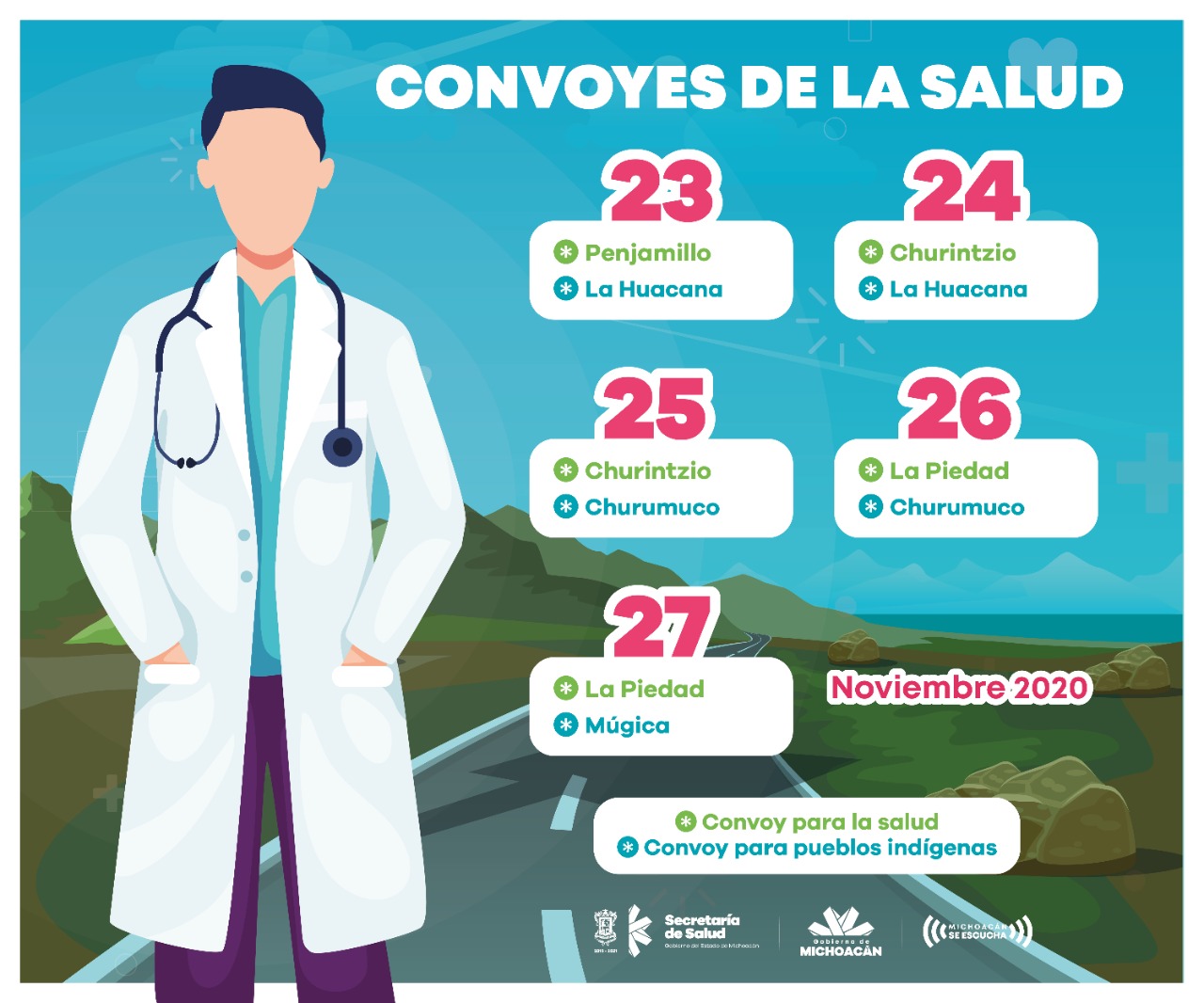 Morelia, Michoacán, a 22 de noviembre de 2020.- La Secretaría de Salud de Michoacán (SSM), desplegará los Convoyes de la Salud y de Pueblos Indígenas a 6 municipios para llevar servicios gratuitos, del 23 al 27 de noviembre.