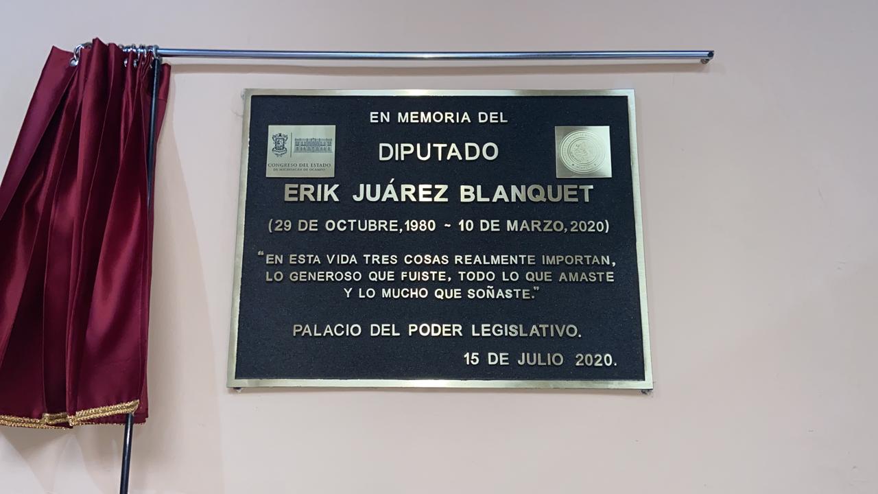 En memoria del diputado Erik Juárez Blanquet, se develó una placa en su honor, en el patio del Congreso del Estado, que a la letra dicta: “En esta vida tres cosas realmente importan, lo generoso que fuiste, todo lo que amaste y lo mucho que soñaste”.