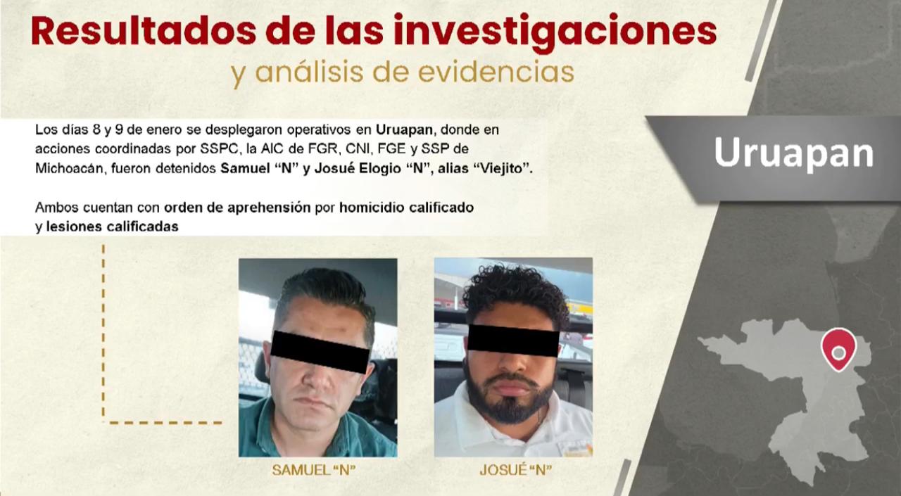 “El día jueves se hizo la detención de quien fuera el encargado de protocolo y de relaciones de Uruapan, que hoy mismo se ejerció la orden de aprehensión por homicidio calificado. (…) El día viernes se hace la otra detención de Josué, que era el vínculo con Samuel, que en las propias dinámicas de los cuestionamientos que se hicieron en estos días, reconocen que ambos conocían del hecho 15 días antes, es decir, dos semanas antes del primero de noviembre tanto Samuel como Josué conocían del objetivo del homicidio de Carlos Manzo”.