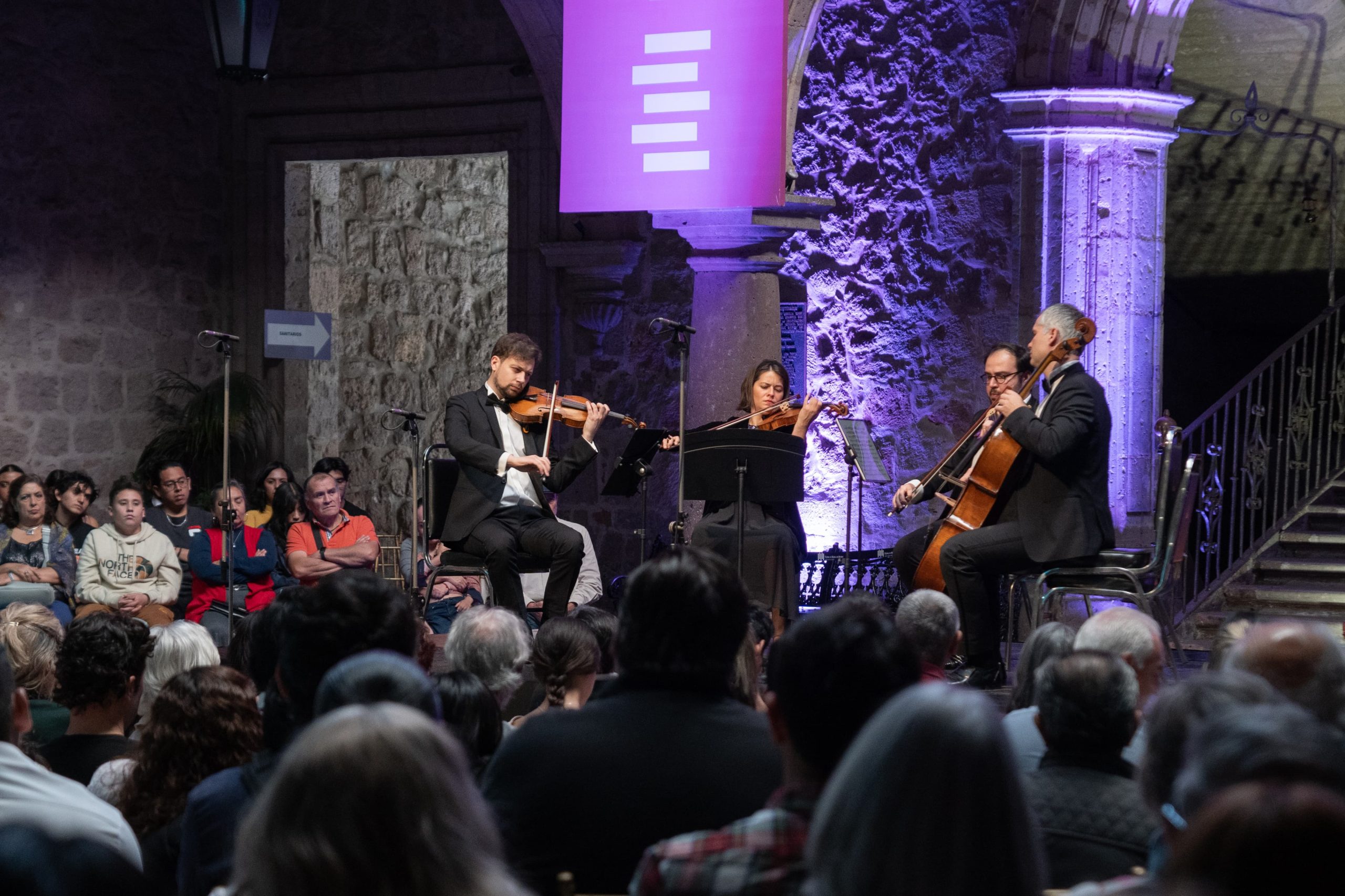 Durante el concierto, el público disfrutó de una selección cautivadora de obras que incluyó el Quartettsatz en do menor de Franz Schubert (1797-1828), seguido de “Ritus” para cuarteto de cuerdas de Johanna Doderer (1969) y el Cuarteto de cuerdas No. 3 de Silvestre Revueltas (1899-1940). Después de esta primera parte, se realizó un intermedio en el que se presentó Telestia de Konstantia Gourzi (1962). Para cerrar la velada, se interpretó el Cuarteto de Cuerdas en do menor de Bruckner, que abarcó los movimientos I. Allegro moderato, II. Andante, III. Scherzo – Presto y finalizó con Rondo – Schnell.