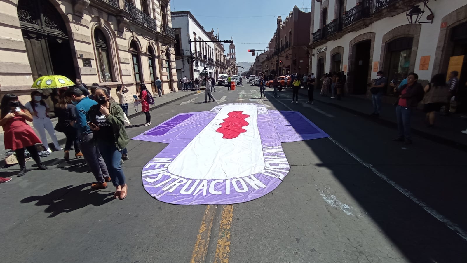 Colectivas feministas colocaron una toalla menstrual gigante afuera del Congreso del estado, sobre la avenida Madero.