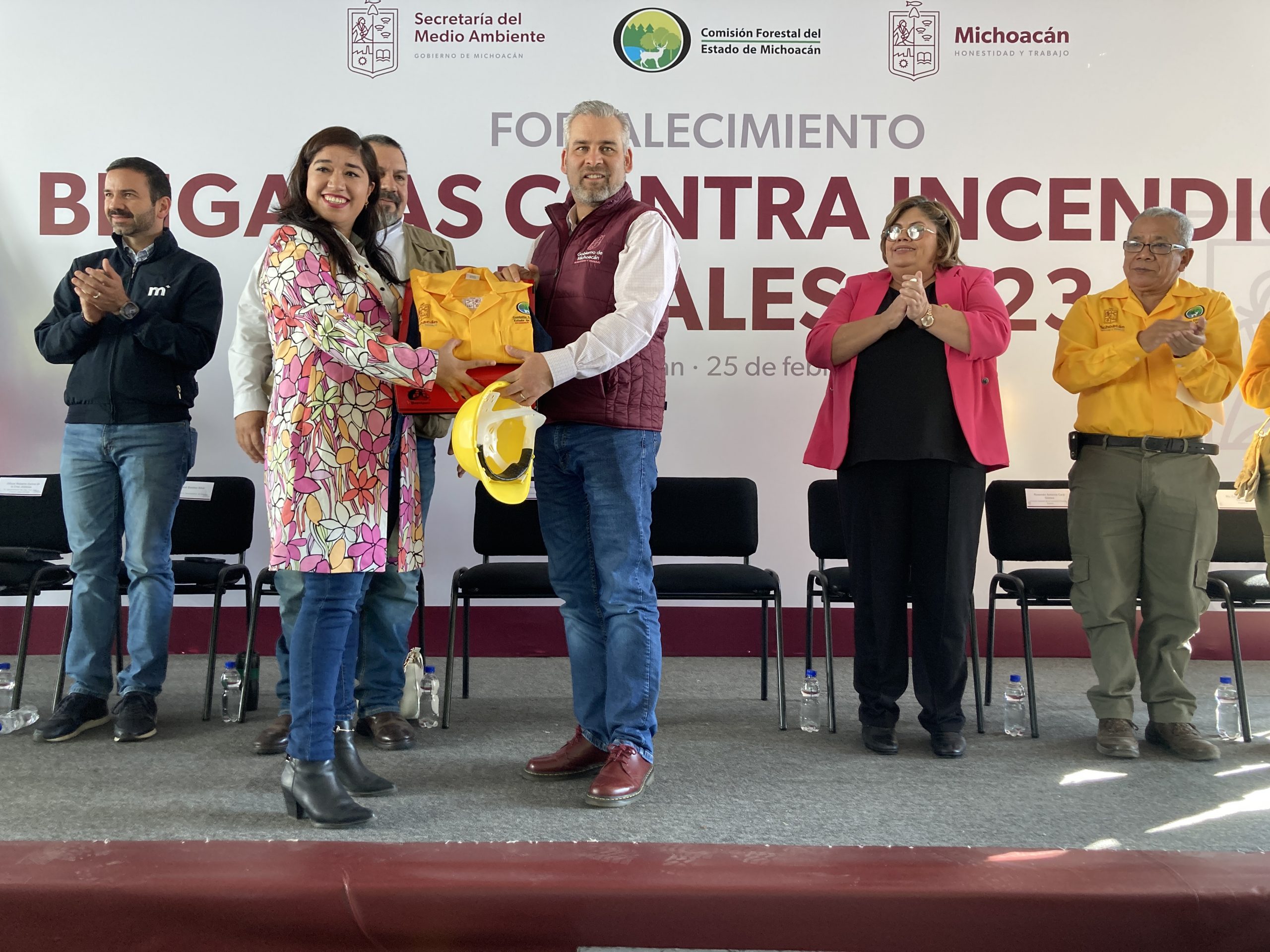 Con la finalidad de fortalecer el combate a incendios forestales en la temporada 2023, autoridades estatales entregaron de manera simbólica equipamiento a más de 70 brigadistas michoacanos.