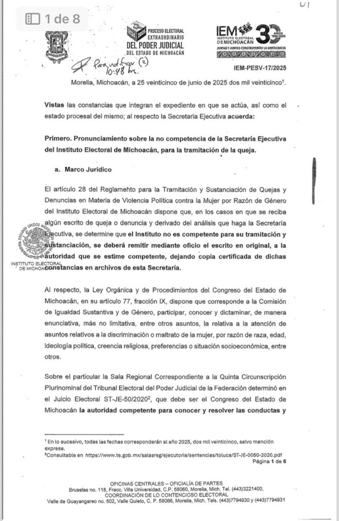 En la resolución, la Secretaría Ejecutiva del IEM estableció que la Sala Regional Toluca del Tribunal Electoral del Poder Judicial de la Federación (TEPJF) resolvió que debe ser “el Congreso del estado la autoridad competente para conocer y resolver las conductas o manifestaciones tachadas como violencia política en razón de género, en contra de las diputadas”.