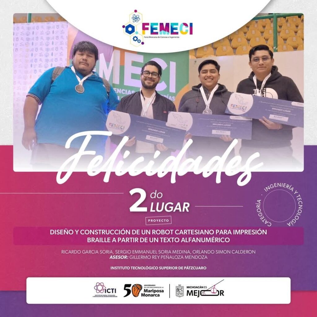 Mientras que el segundo sitio fue para el proyecto “Diseño y construcción de un robot cartesiano para impresión braille a partir de un texto alfanumérico”, realizado por Ricardo García, Sergio Soria y Orlando Calderón, del Instituto Tecnológico Superior de Pátzcuaro, en la categoría de Ingenierías y Tecnología.