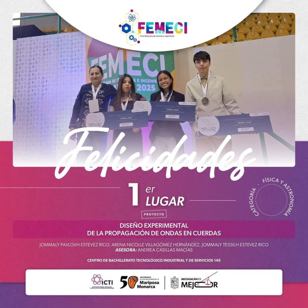 La directora del Instituto de Ciencia, Tecnología e Innovación (ICTI), Alejandra Ochoa informó que el primer puesto fue para el proyecto “Diseño experimental de la propagación de ondas en cuerdas”, desarrollado por Jommaly Pavlovh, Arena Villagómez y Jommaly Estevez, del Bachillerato Tecnológico Industrial y de Servicios (CBTis) 149, en la categoría de Física y Astronomía.