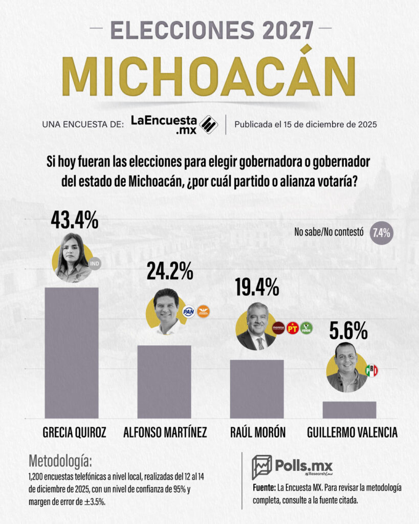 En respuesta a la pregunta “Si hoy fueran las elecciones para elegir gobernador o gobernadora del estado de Michoacán ¿Por cuál partido o alianza votaría?”, estos son los resultados publicados el pasado 15 de diciembre de 2025.
