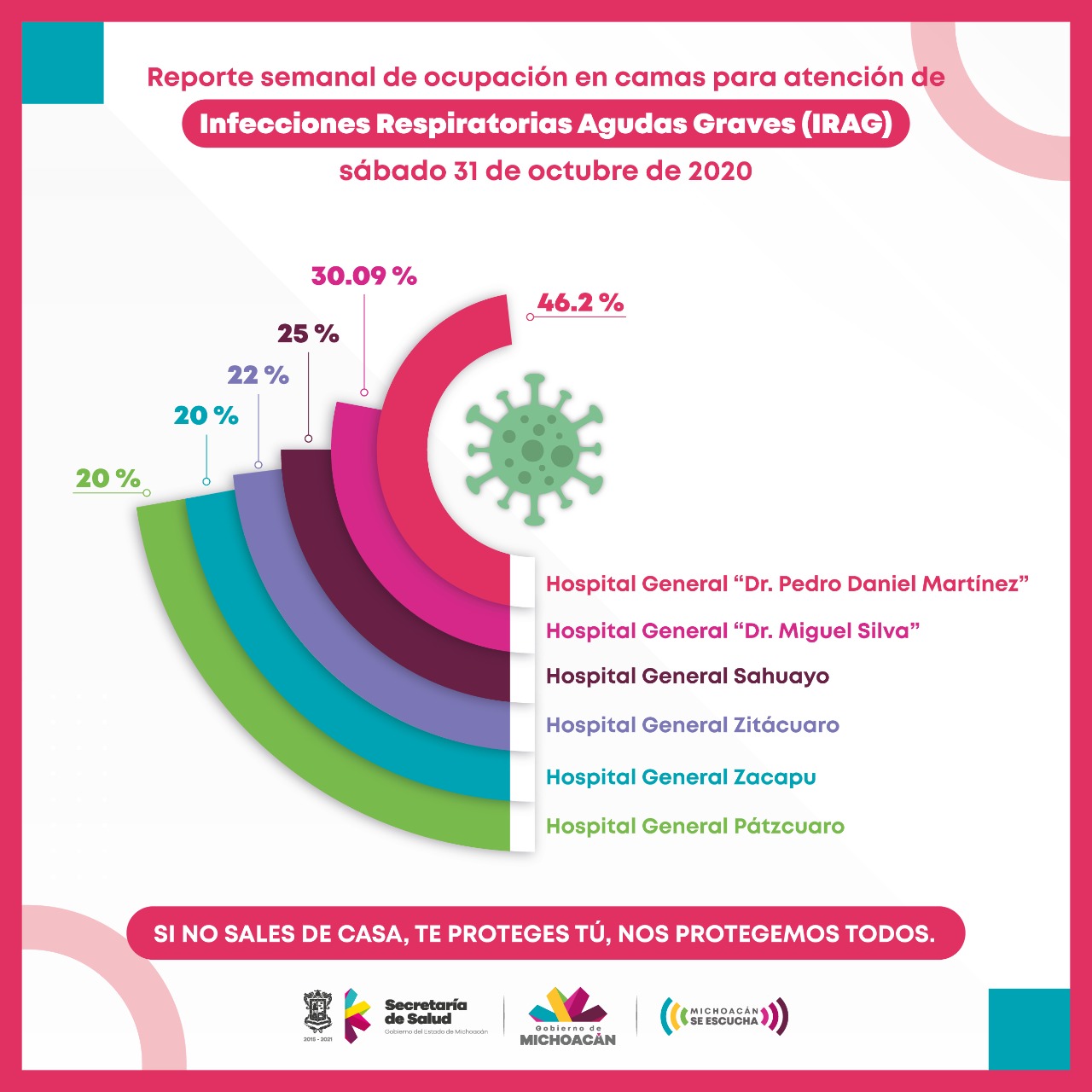 El hospital “Dr. Pedro Daniel Martínez”, registra una ocupación del 46.2 por ciento, y el “Dr. Miguel Silva”, el 30.09 por ciento; a estos le siguen el de Sahuayo, con el 25 por ciento; Zitácuaro, con el 22 por ciento y Zacapu y Pátzcuaro, con el 20 por ciento.