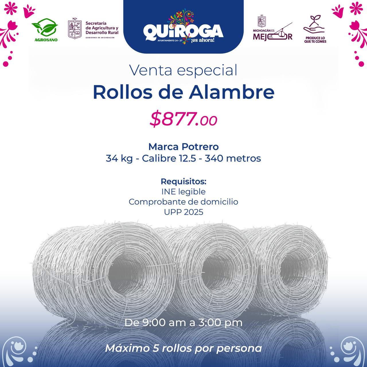 Quiroga, Michoacán.- Gracias a las gestiones realizadas por la presidenta municipal, Alma Mireya González Sánchez, ante el Gobierno del Estado de Michoacán, a través de la Secretaría de Agricultura y Desarrollo Rural (SADER), el Ayuntamiento de Quiroga pone en marcha una venta especial de rollos de alambre marca Potrero.