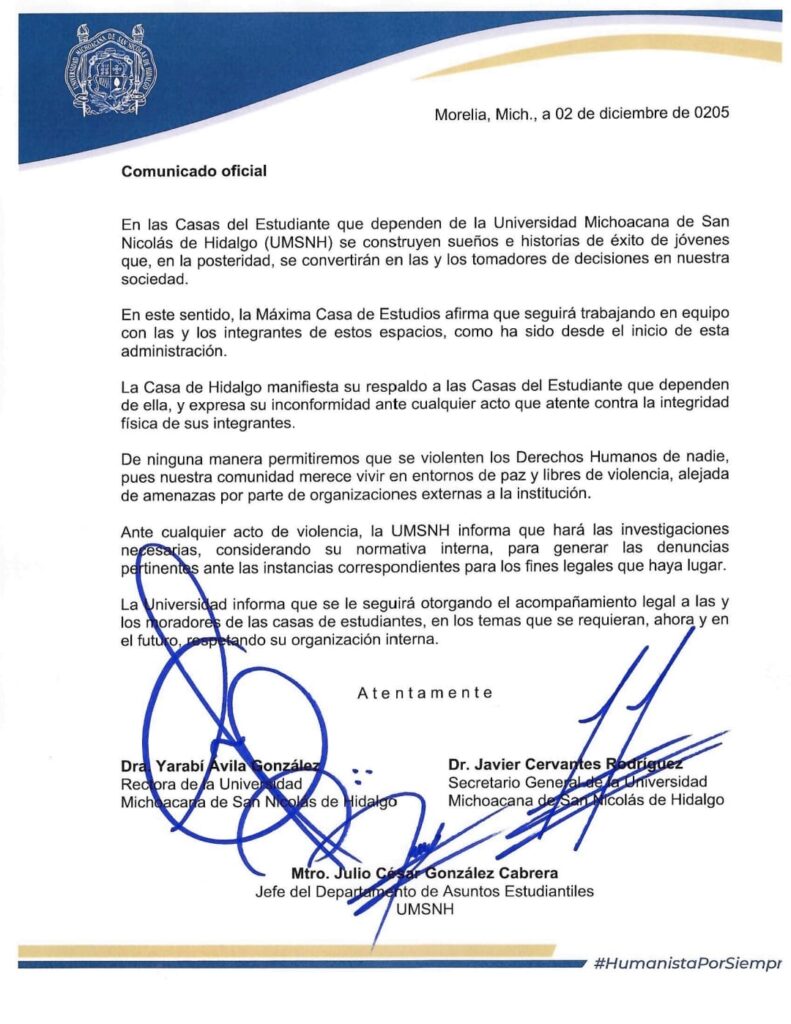 Morelia, Mich.- La Casa del Estudiante Nicolaita informó que fue expulsado el morador Inés Axayácatl Jorge Medina, integrante activo del Frente Nacional de Lucha por el Socialismo (FNLS), luego de que fuera sorprendido consumiendo sustancias ilícitas al interior del recinto estudiantil.