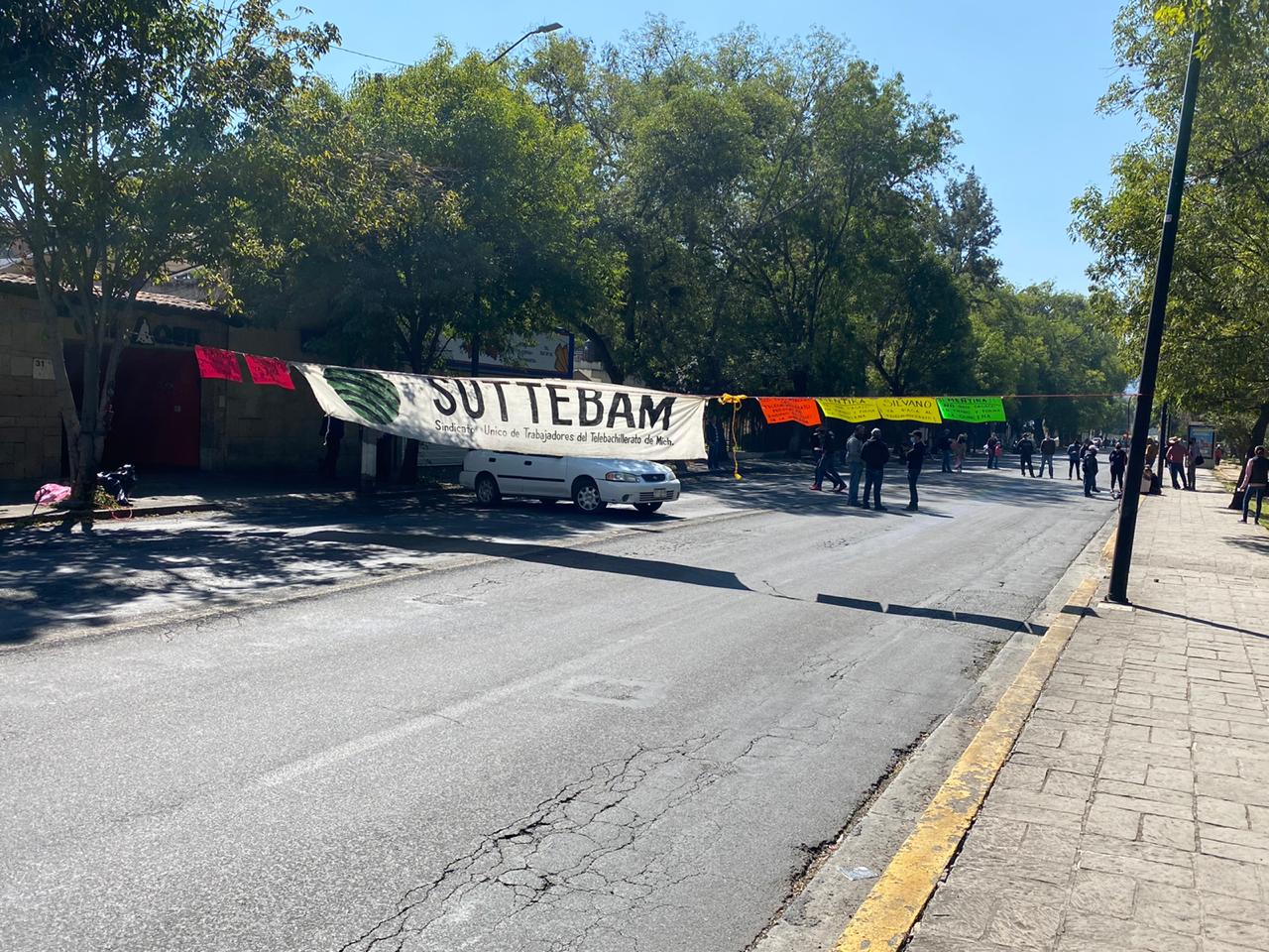 Morelia, Michoacán.- Este miércoles Integrantes del Sindicato Único de Telebachillerato de Michoacán (SUTTEBAM), tomaron la avenida Ventura Puente, frente a la Secretaría de Finanzas y Administración del gobierno estatal.