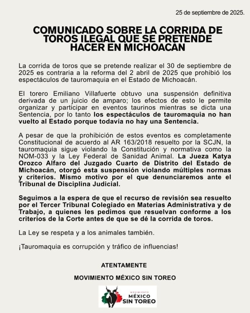 Respecto a la realización de este evento, el colectivo Michoacán sin Tauromaquia anunció que denunciará ante el Tribunal de Disciplina Judicial el amparo concedido por la titular del Juzgado Cuarto de Distrito del Estado de Michoacán, al considerar que realizar la corrida durante la vigencia de este amparo violaría la norma estatal.
