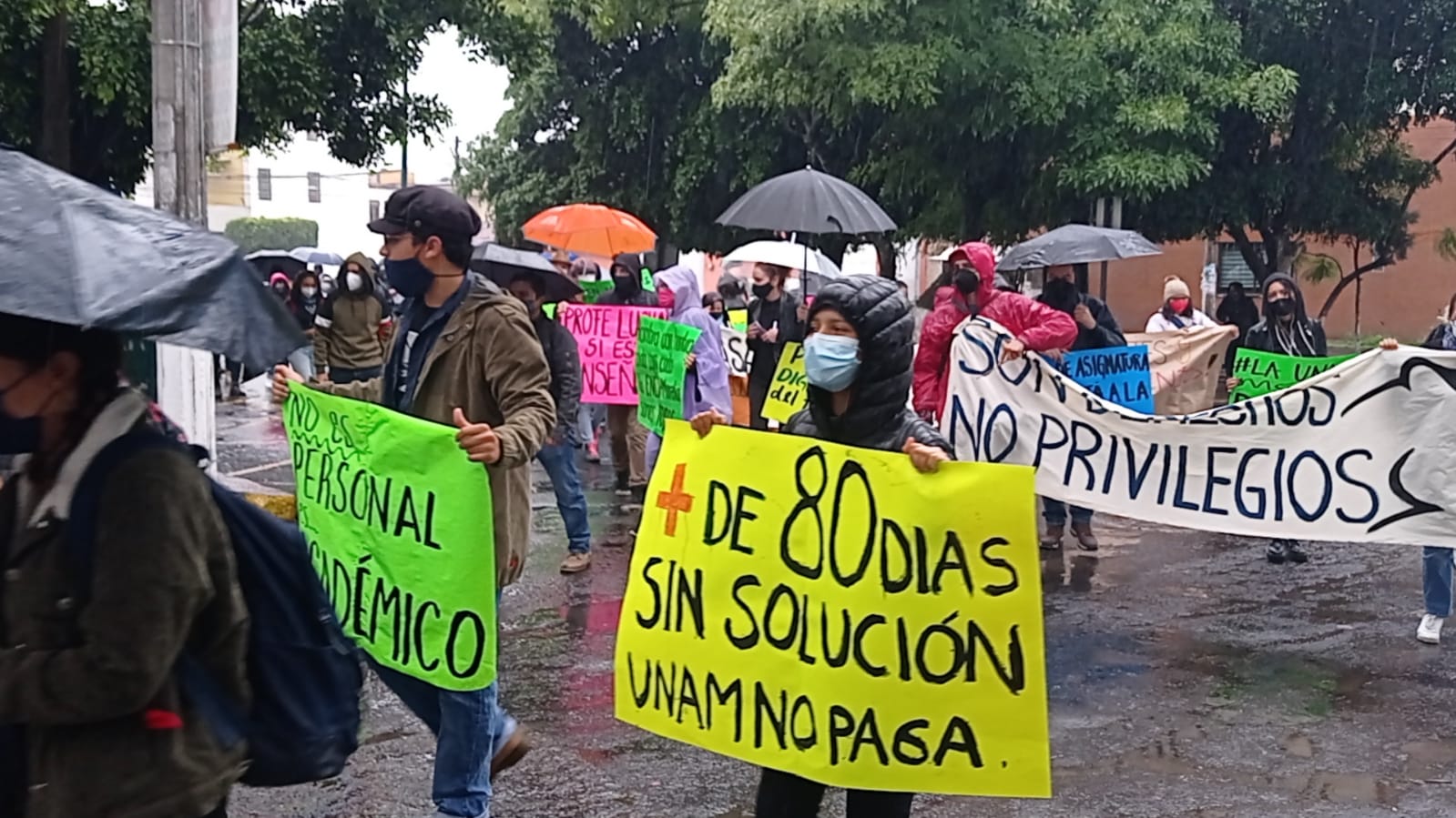 Con mantas y consignas con la leyenda “La UNAM no paga”, los manifestantes salieron desde Xangari, en la salida a Pátzcuaro, pasaron por avenida la Huerta hasta llegar a la avenida Madero y concluir en Palacio de Gobierno.