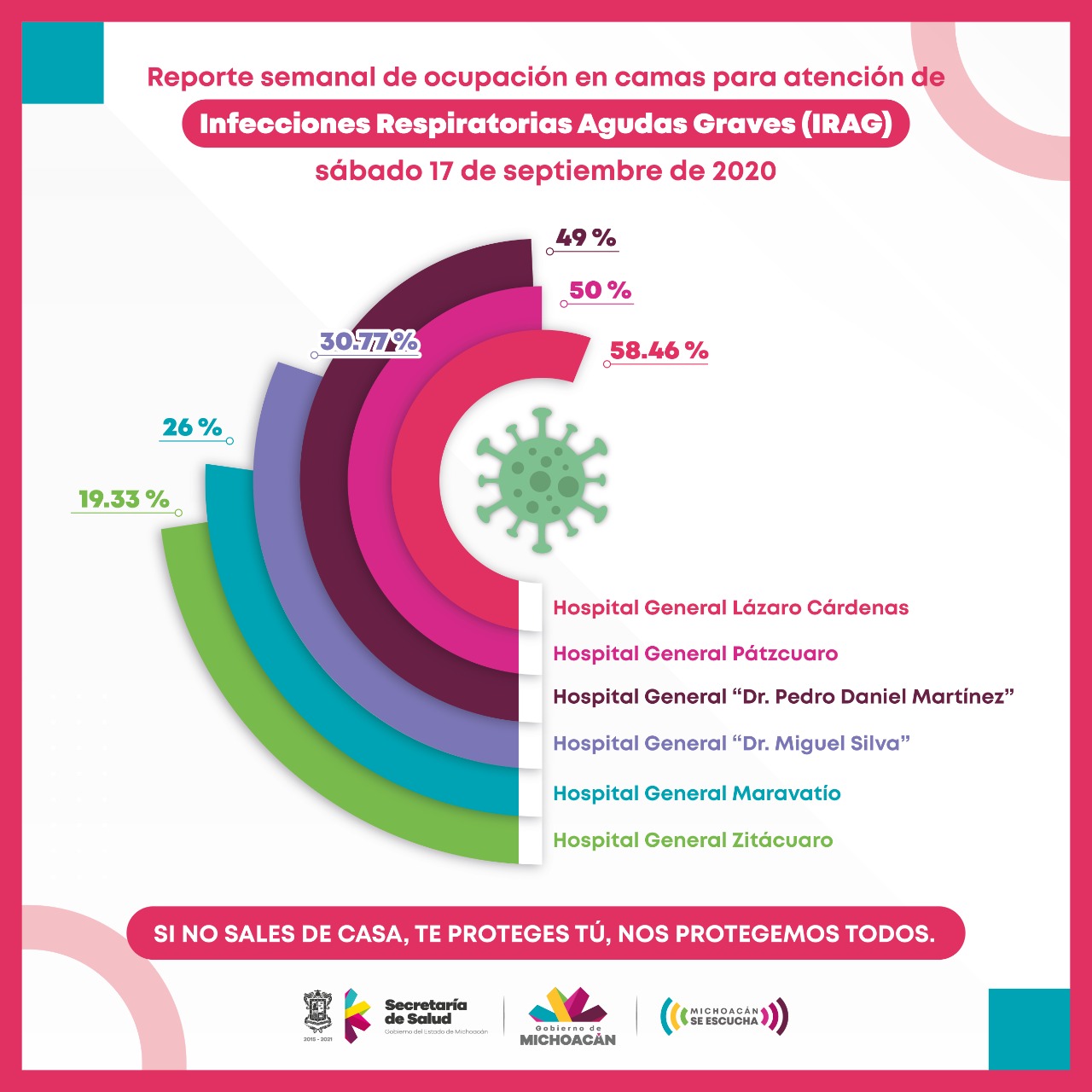 Morelia, Michoacán.- Derivado del comportamiento epidemiológico de COVID-19, las camas reconvertidas para la atención de infecciones Respiratorias Agudas Graves (IRAG), de seis hospitales de la Secretaría de Salud de Michoacán (SSM), registran una ocupación de entre 19 y 58.46 por ciento.