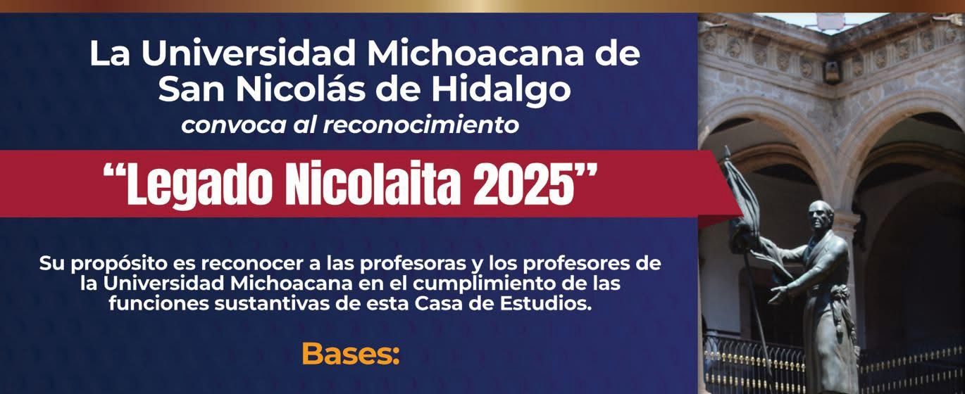 Morelia, Michoacán.- Como una forma de reconocer el trabajo y la trayectoria de las y los docentes de la institución, la Universidad Michoacana de San Nicolás de Hidalgo (UMSNH) entregará por segunda ocasión en su historia el galardón “Legado Nicolaita 2025”, por lo que se invita a la comunidad a participar con propuestas.