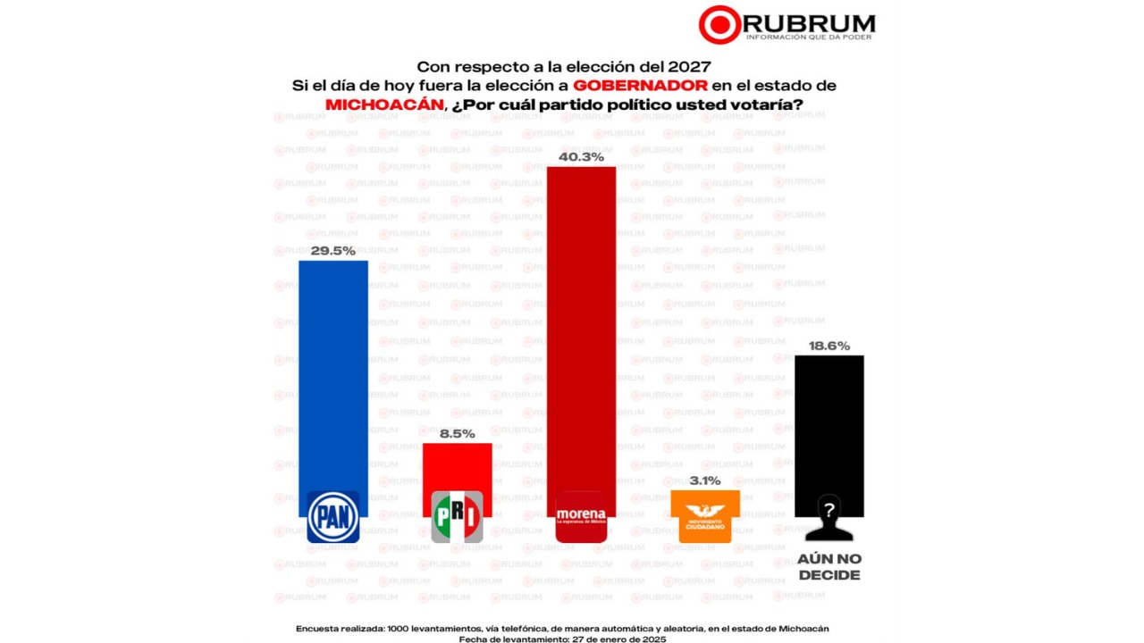 La casa especializada en realizar estudios de opinión pública RUBRUM presentó los resultados de encuesta levantada el pasado 27 de enero en Michoacán, donde Morena alcanza el 40.3% de las preferencias, le sigue el PAN con el 29.5%, luego los indecisos con el 18.6%; en cuarto lugar, el PRI con apenas el 8.5% y con un lejano 3.1% Movimiento Ciudadano.