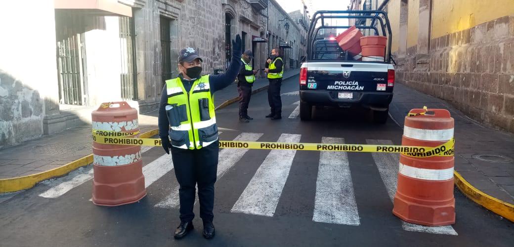 Morelia, Michoacán, Como medida para reducir la movilidad y prevenir nuevos contagios del COVID-19, elementos de la Secretaría de Seguridad Pública (SSP), realizan cortes a la circulación en el Centro de la capital michoacana.