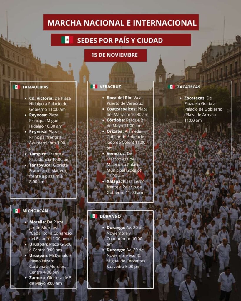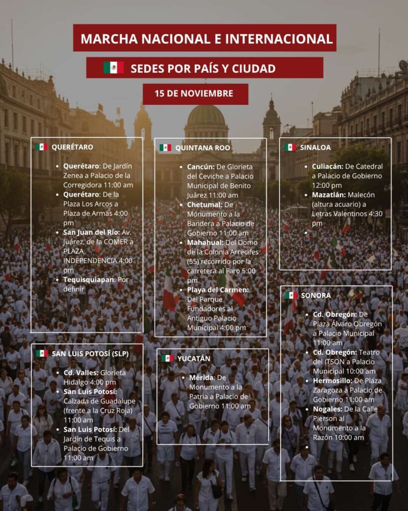 Más de 90 ciudades de México, Estados Unidos de Norteamérica, Canadá y Países Bajos se sumarán este 15 de noviembre a la Movilización convocada por la denominada Generación “Z”, en demanda principalmente de que se implemente un mecanismo ciudadano efectivo de Revocación de Mandato.