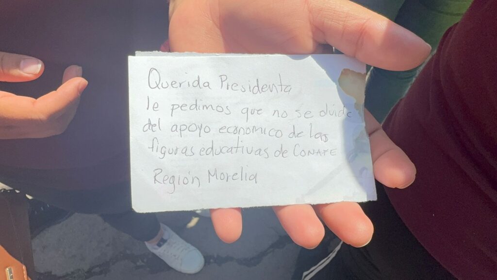 Entre las solicitudes que le hicieron llegar, está la de unos jóvenes, que forman parte del Consejo Nacional de Fomento Educativo, (CONAFE), quienes a través de una pequeña carta le pidieron a la mandataria federal “Que se acuerden de ellos, y que les den un poco más de apoyos”