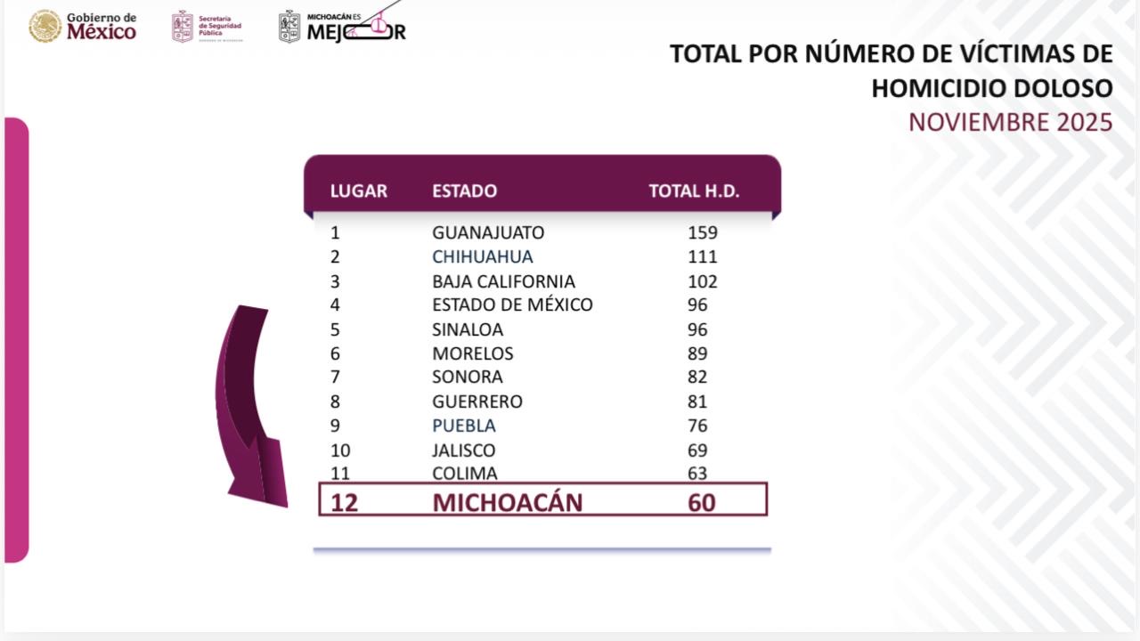 Con las cifras de noviembre, Michoacán salió del grupo de 10 estados con mayor número de homicidios dolosos del país y con 60 asesinatos se ubicó en el lugar 12, de acuerdo al ranking que expuso el secretario de Seguridad Pública, José Antonio Cruz Medina, en conferencia de prensa.