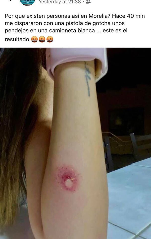 “Una camioneta blanca que iba con chavos, pasaron y me dispararon una paintball. Me asusté muchísimo, de inmediato empezó a salir sangre y se me hizo una perforación en la piel”.