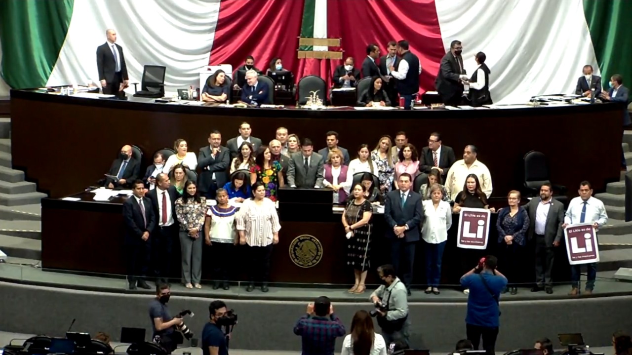 Con un total de 298 votos a favor, cero votos en contra y con 197 abstenciones de los legisladores del PRI, PAN y PRD, se aprobó en lo general la iniciativa que modifica los artículos 1, 5, 9 y 10 de la Ley Minera, con lo que se establece que el litio es patrimonio de la nación, por lo que su exploración, explotación y aprovechamiento de este mineral queda únicamente a cargo del Estado.